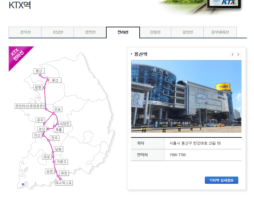 설명: 서울과 전라도를 연결하는 노선으로, KTX와 일반 열차가 운행됩니다. 주요 도시인 광주와 전주를 포함합니다.